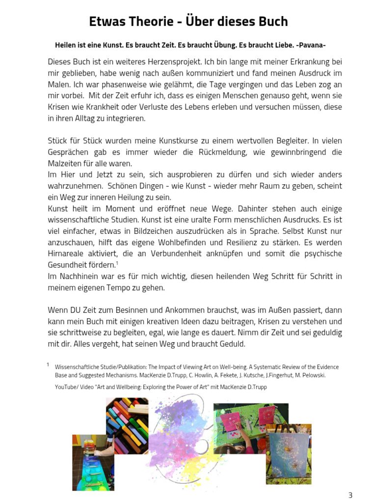 Kreatives Gestalten ist oftmals ein hilfreiches Ausdrucksmittel, wenn in Krisen Worte fehlen. Kreativ zu sein kann zu Entspannung und innerer Ruhe führen sowie persönliche Ressourcen aktivieren. In diesem Buch werden Zeichnen, Malen oder das Schreiben kreativer Texte als kleine Selfmade-Projekte angeboten, um sich selbst wieder zu finden und schwierige Situationen zu begleiten. Das Buch kostet 19,95 EUR (Hardcover).