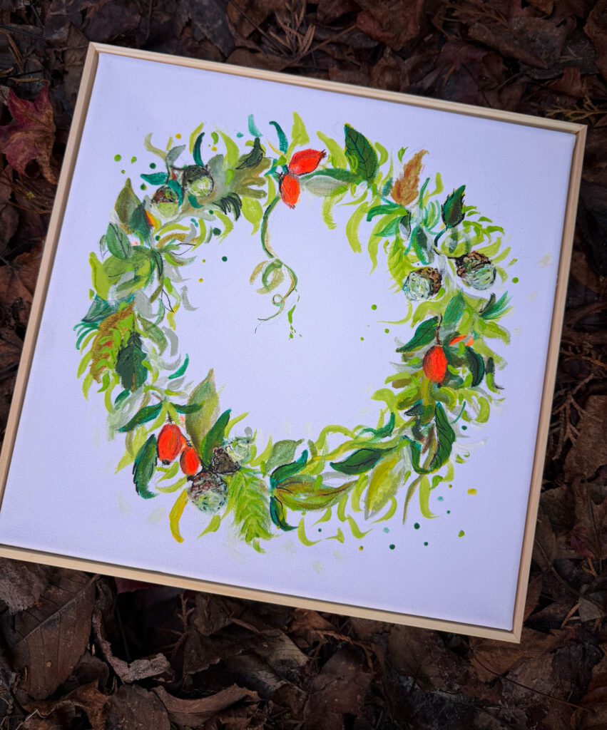 Wir malen zunächst den Hintergrund, zeichnen dann den Kranz vor und geben den Blättern mit Strukturen besonderen Stand und malen sie in deinen Farben an. Du nimmst dein fertiges Bild mit nach Hause.